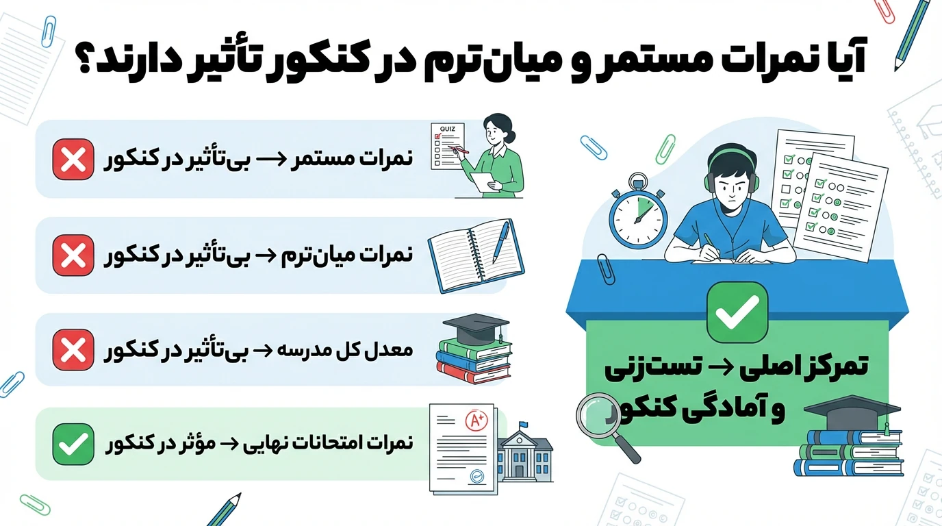 • ❌ نمرات میان‌ترم → بی‌تأثیر در کنکور