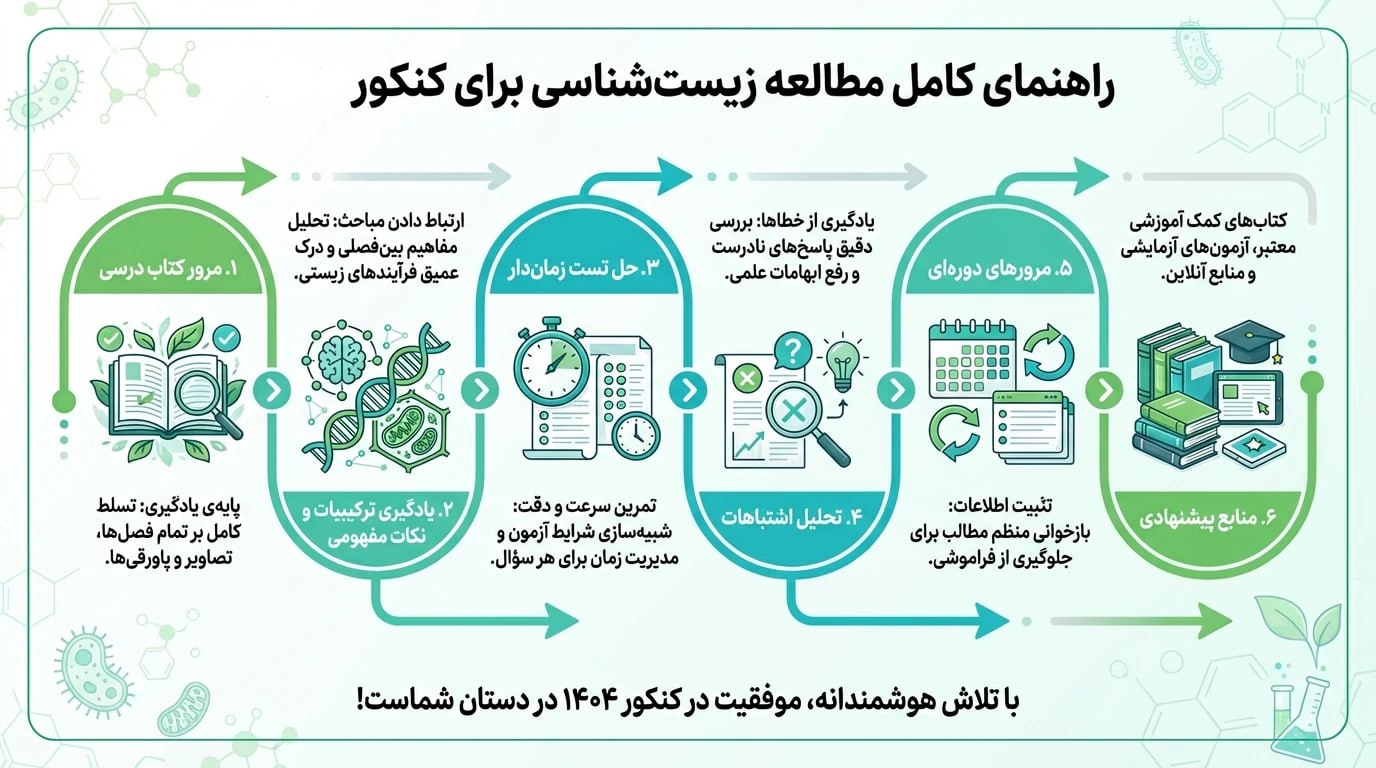زیستشناسی درسی مفهومی، تصویری و چندلایه است. یادگیری آن فقط با «خواندن» اتفاق نمیافتد؛ بلکه ترکیبی از مرور، روخوانی سریع، درک مفهمومی، تحلیل شکلها، تستخوانی طراحمحور و در نهایت مرور فعال است.