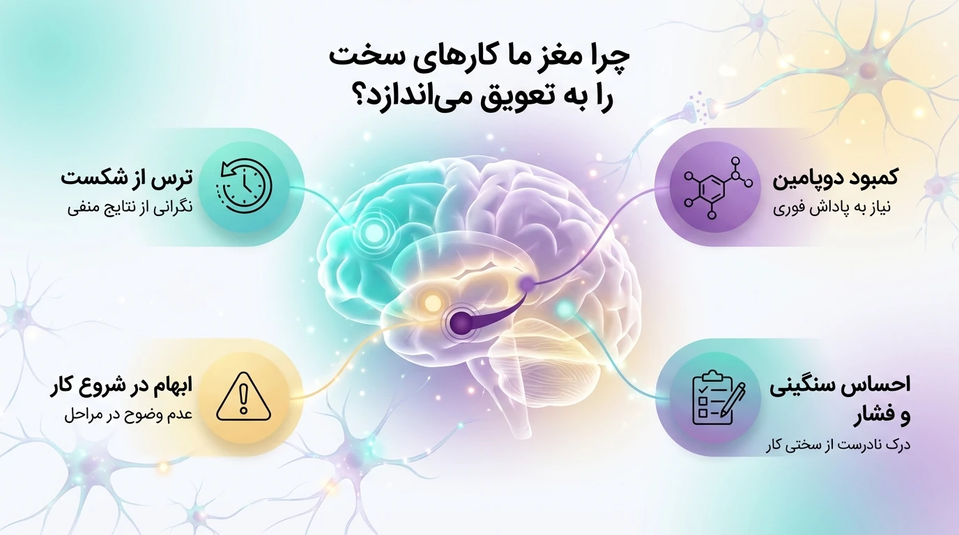 این رفتار تقصیر تو نیست عزیزم. مکانیزم مغز دقیقا طوری طراحی شده که سخت‌ها را پنهان کند و سمت آسان‌ها هل دهد. در ادامه، هم توضیح علمی‌اش را می‌بینی، هم تکنیک‌های عملی برای غلبه بر این مقاومت.