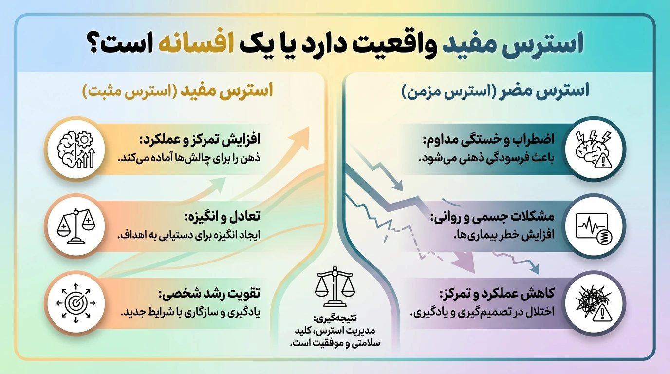 نتیجه: چیزی به نام «استرس مفید» وجود ندارد؛ فقط هشدار سالم داریم. هر چیزی بیشتر از آن، وارد محدودهی مخرب میشود.