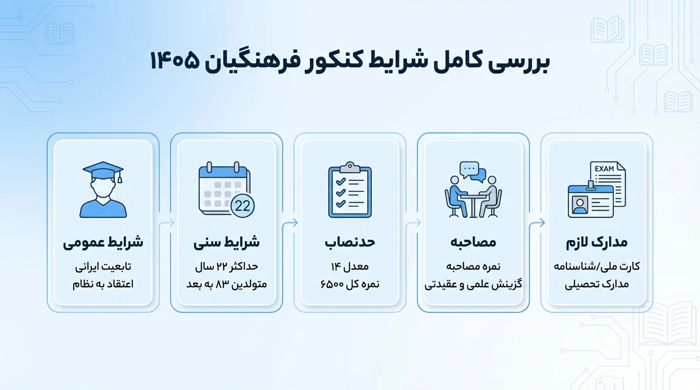 کنکور فرهنگیان ۱۴۰۵ با وجود تغییرات در تقویم کنکور سراسری، ساختار اصلی خود را حفظ کرده و همچنان شامل سه بخش منابع، آزمون کتبی و مصاحبه است. مهمترین عوامل در قبولی، معدل پایه یازدهم و دوازدهم و همچنین مصاحبه عمومی و تخصصی هستند. با مطالعه دقیق منابع، آمادهسازی برای مباحث اعتقادی و اجتماعی، و شناخت روند مصاحبه میتوان احتمال قبولی را بهطور قابل توجهی افزایش داد.