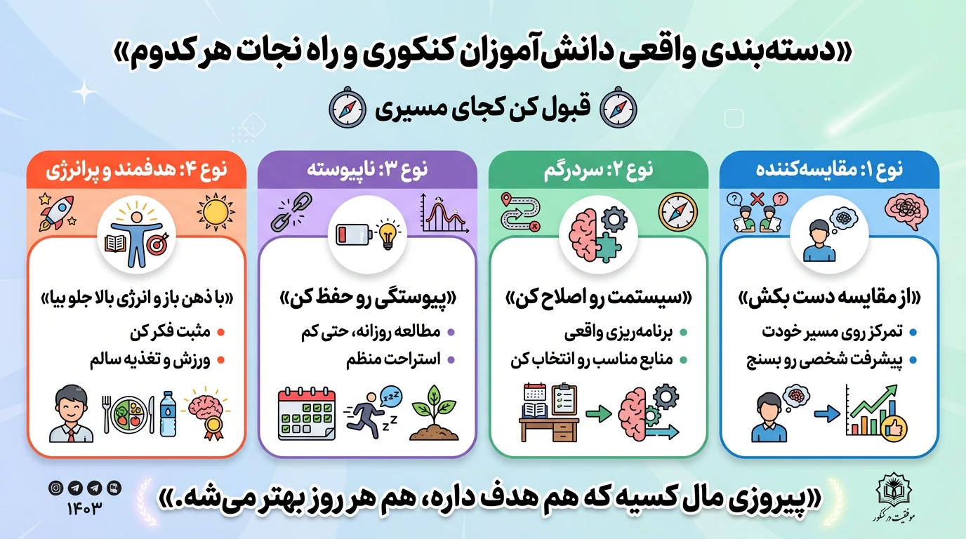 طبق تجربهی چندین سالهی کار با دانشآموزان پشتکنکوری و دوازدهم، میشه گفت دانشآموزای کنکوری این روزها تو چند دستهی مشخص قرار میگیرن. شناخت این دستهها یه فایده مهم داره: