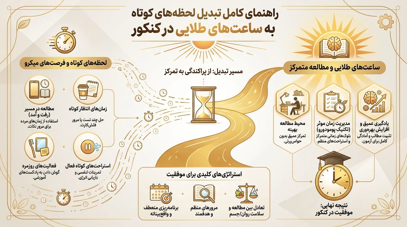 همین دقایق کوچک اگر جمع شوند، میتوانند روزانه یک تا سه ساعت مطالعه سبک و کارآمد به شما اضافه کنند. بسیاری از رتبههای برتر، موفقیتشان را مدیون همین استمرار کوچک اما مؤثر هستند.