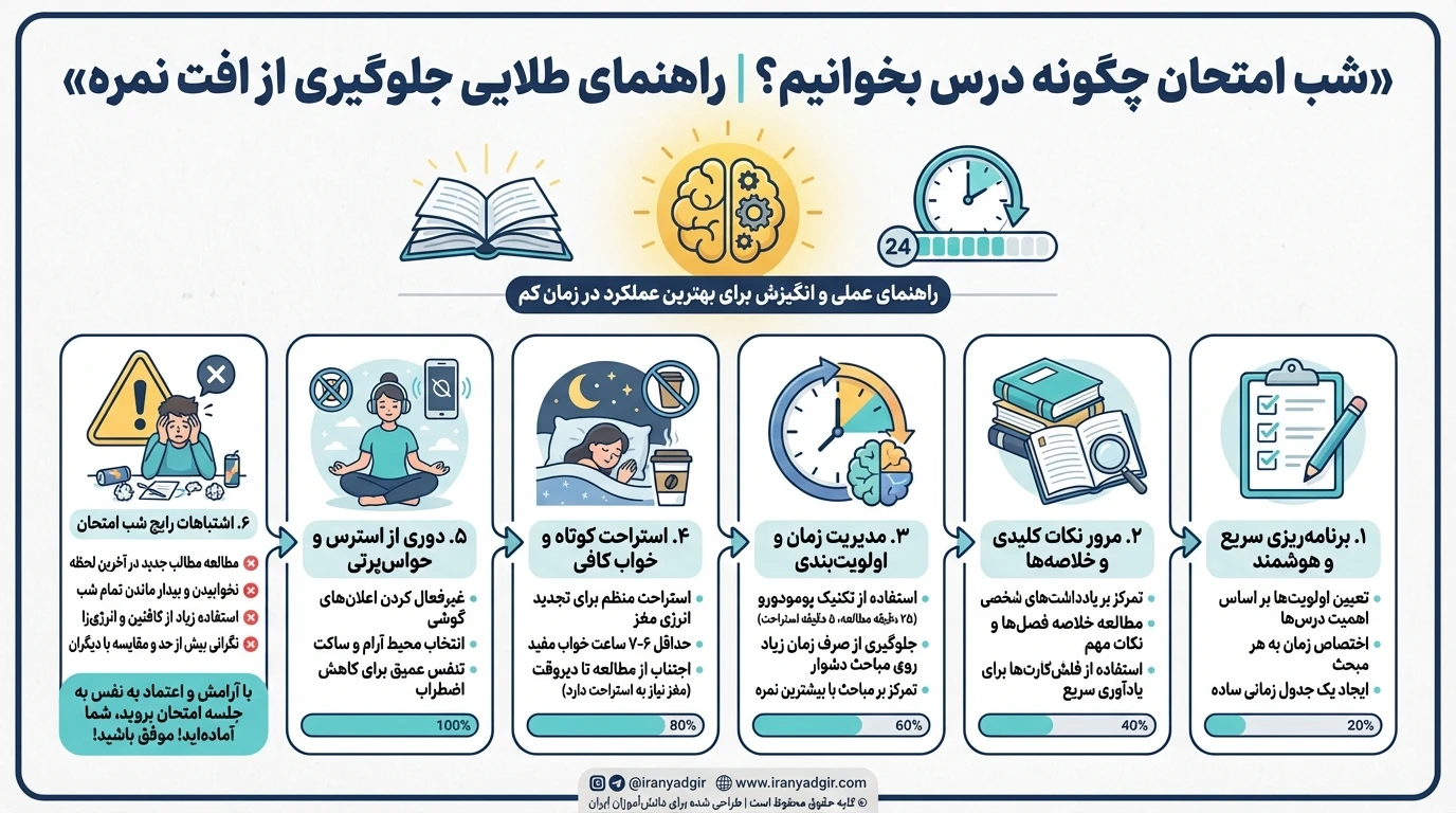 در شب امتحان، باید سطحی اما هدفمند پیش بروید. همین مقدار مطالعه باعث می‌شود نمره شما از محدوده خطر (مثلاً زیر ۱۵) خارج شود.