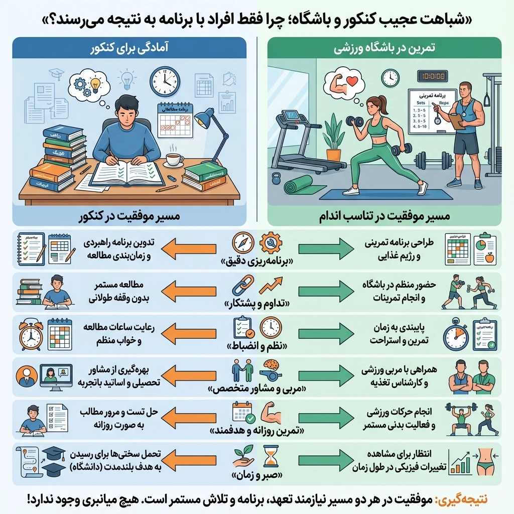 خیلیها در نگاه اول فکر میکنند کنکور و باشگاه هیچ شباهتی به هم ندارند؛ یکی درس و کتاب است، دیگری ورزش و عرق ریختن. اما اگر کمی عمیقتر نگاه کنیم، متوجه میشویم که این دو مسیر، شباهتهای عجیبی دارند؛ شباهتهایی که میتوانند راز موفقیت یا ریزش داوطلبان کنکور را بهخوبی توضیح دهند.در این مقاله میخواهیم با یک مثال ساده اما واقعی، مسیر موفقیت در کنکور را شفافتر کنیم.