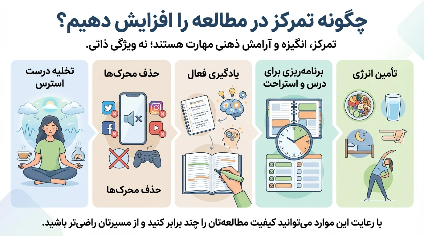 مطالعه با تمرکز، مهمترین عامل افزایش کیفیت یادگیری است. احتمالاً برای شما هم پیش آمده که قرار بوده یک ساعت و نیم درس بخوانید، اما وقتی به خودتان میآیید میبینید فقط ۲۰ دقیقه مفید مطالعه داشتهاید و باقی زمان درگیر افکار پراکنده بودهاید. در این مقاله، به مهمترین پرسشهای پرتکرار دانشآموزان میپردازیم و راهکارهای ساده اما کاربردی برای افزایش تمرکز، ایجاد انگیزه، برنامهریزی اصولی، مدیریت انرژی و کنترل استرس ارائه میکنیم.